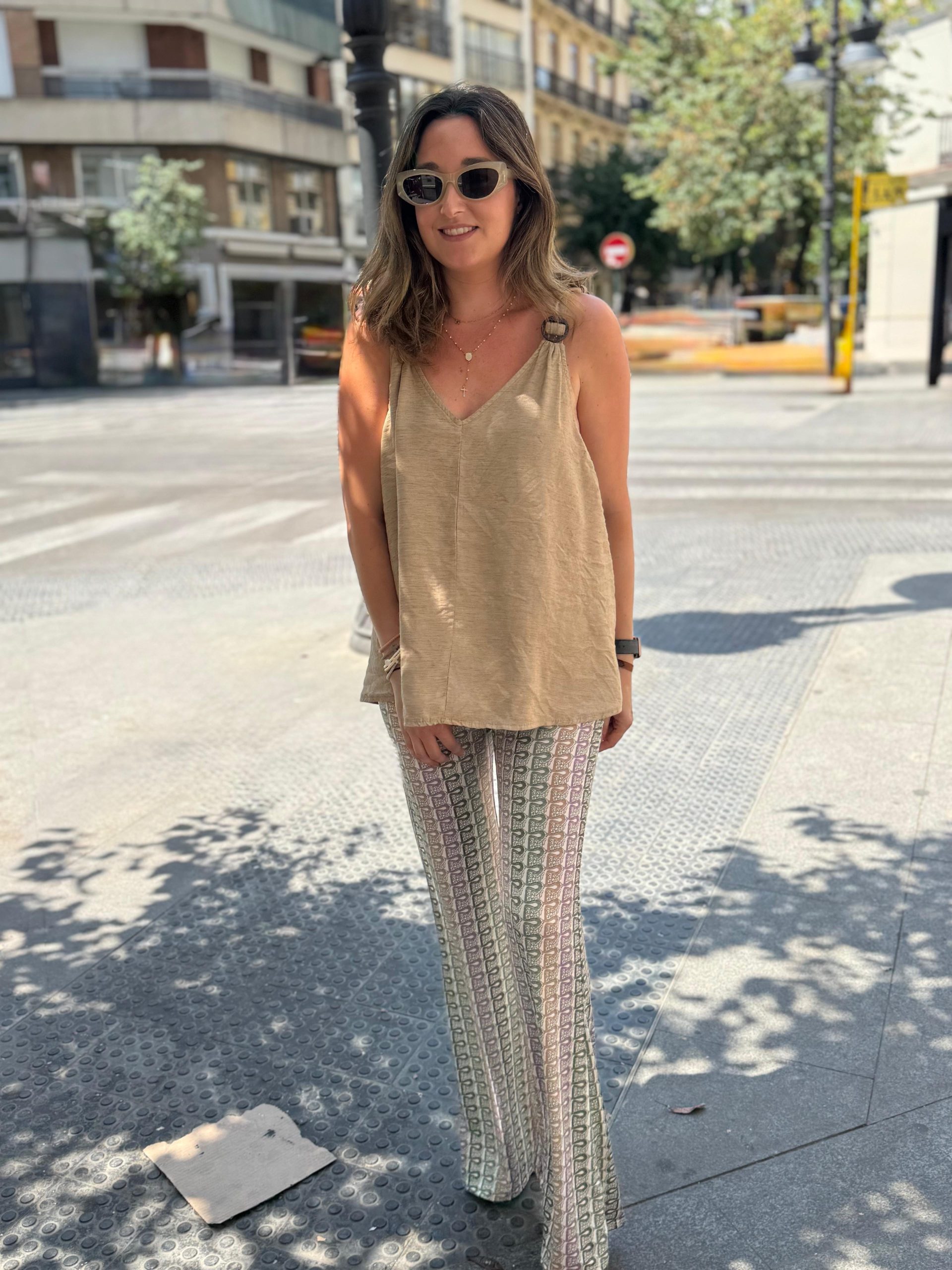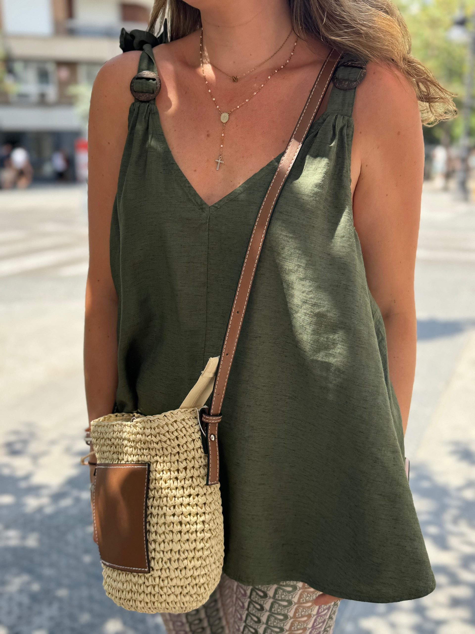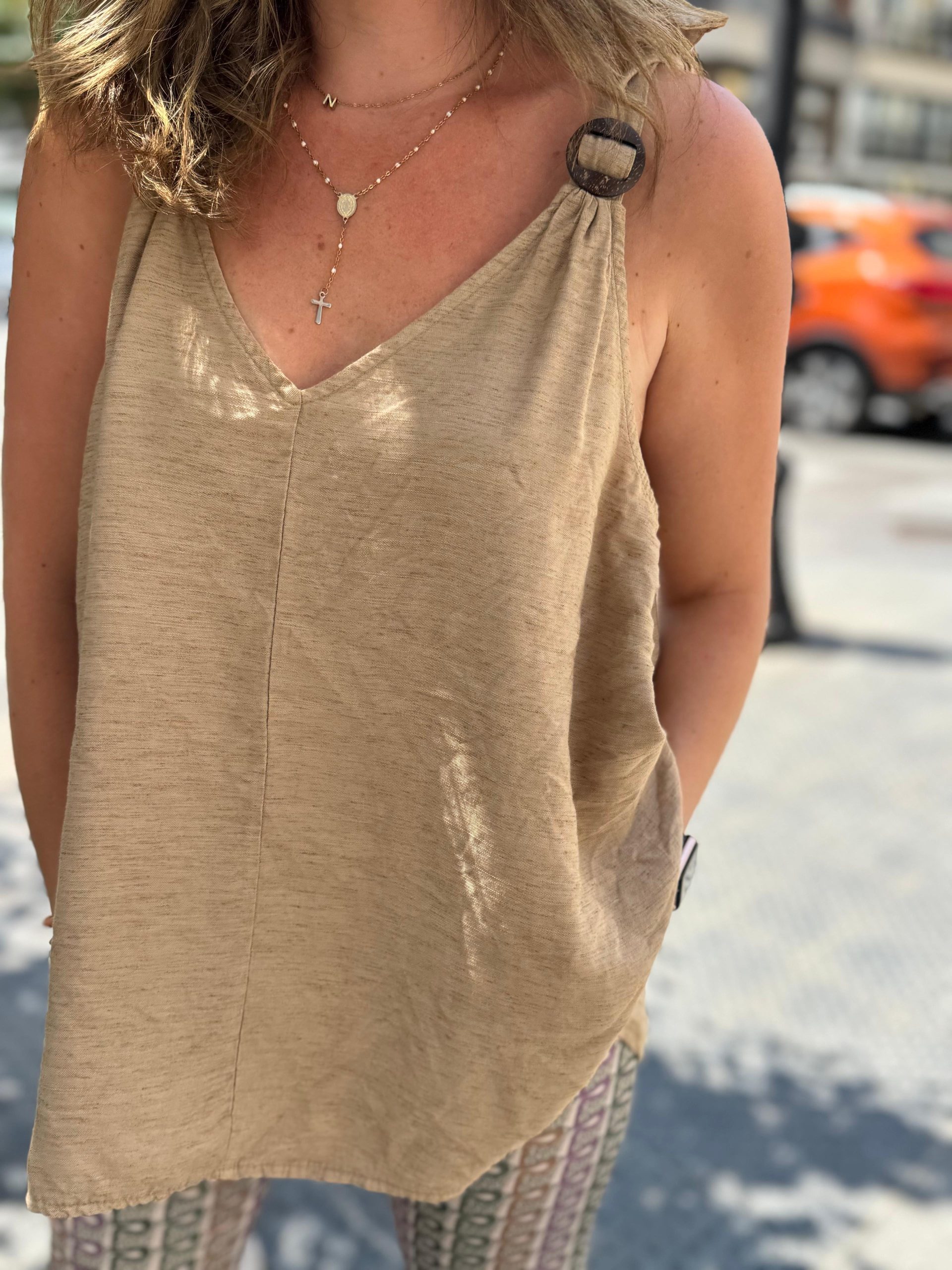 TOP LISO CON DETALLE HEBILLA Y LAZO EN EL HOMBRO. AJUSTABLE EN HOMBRO. TALLA ÚNICA. APROX HASTA UNA 42.