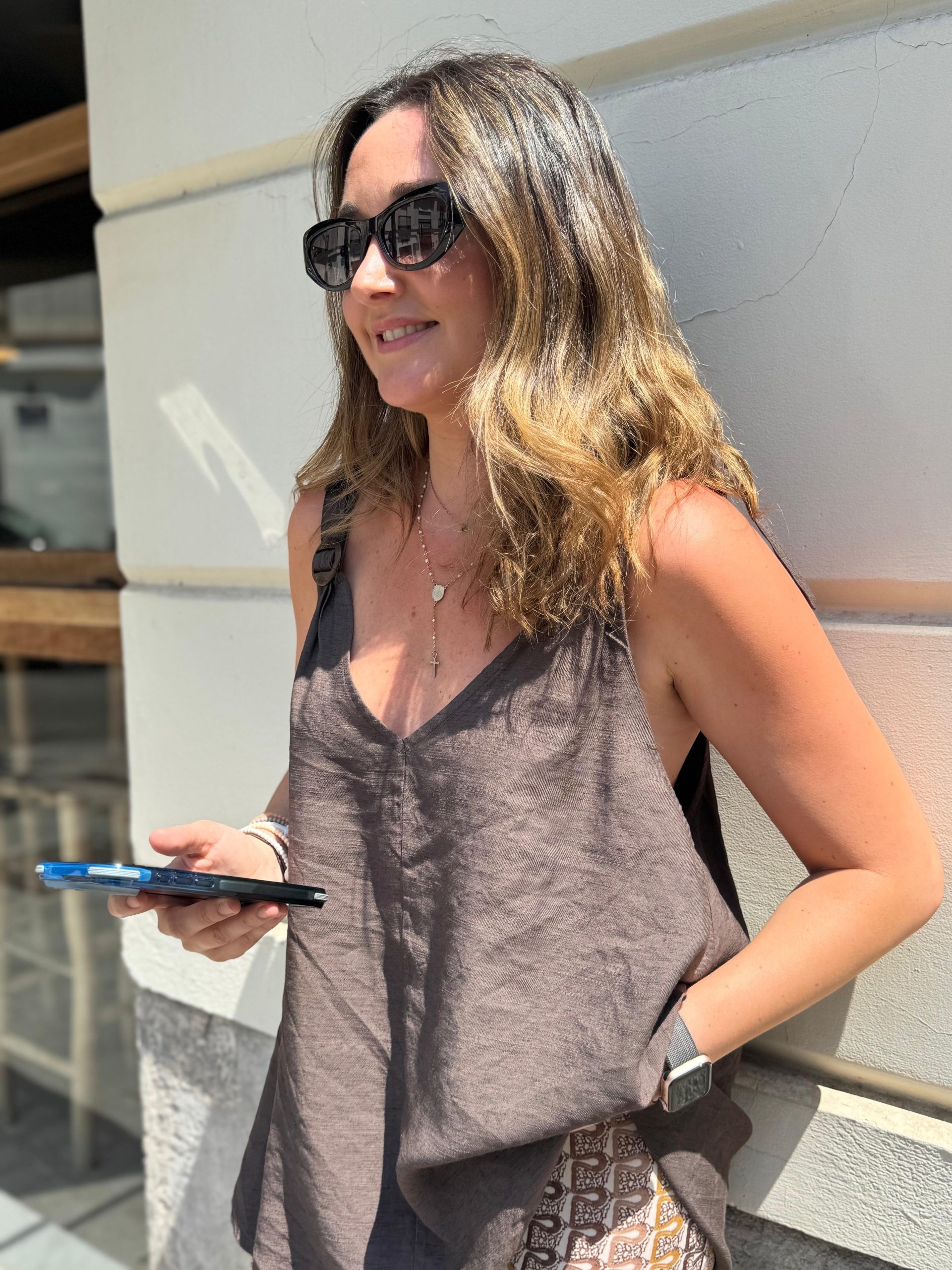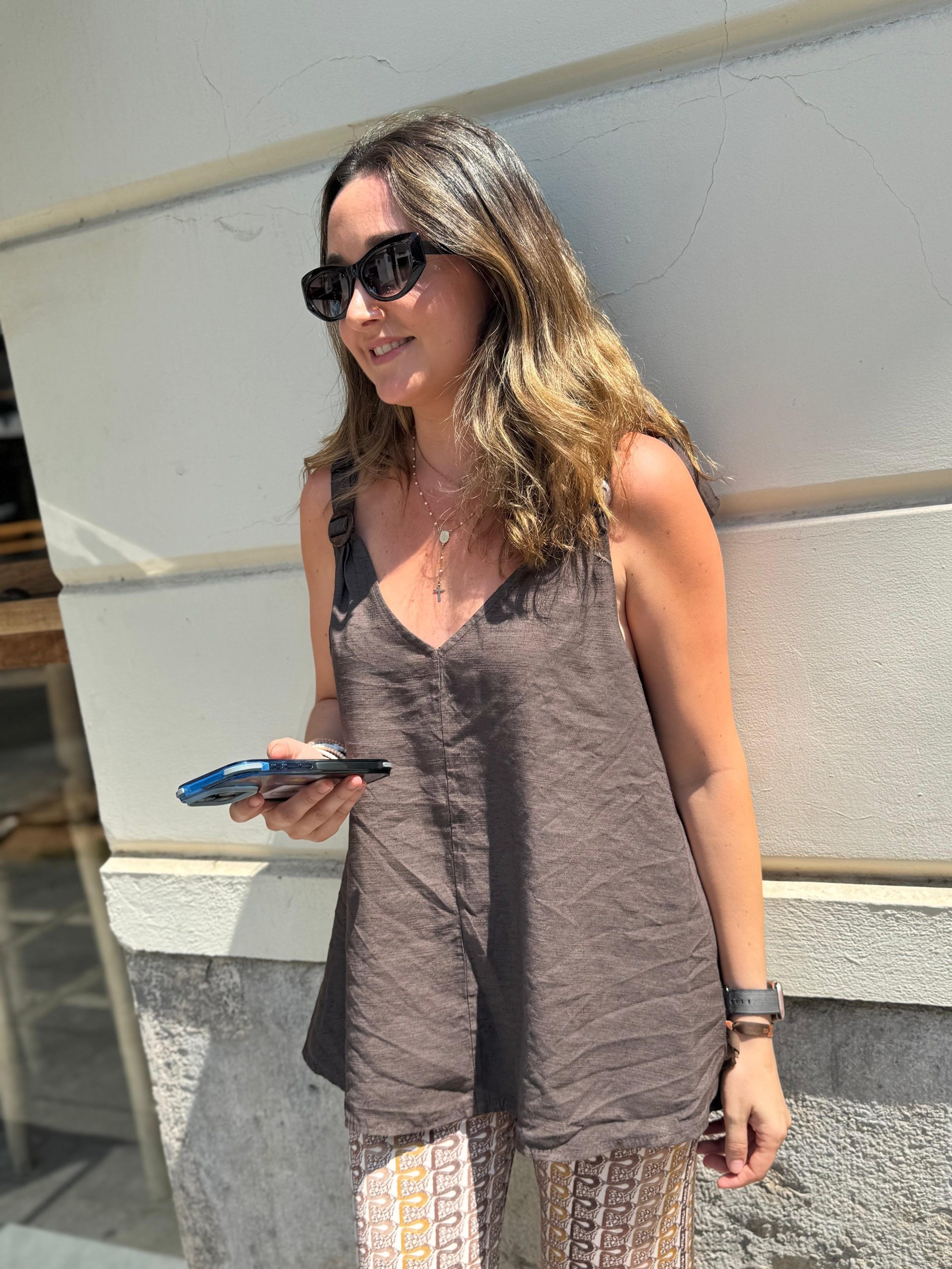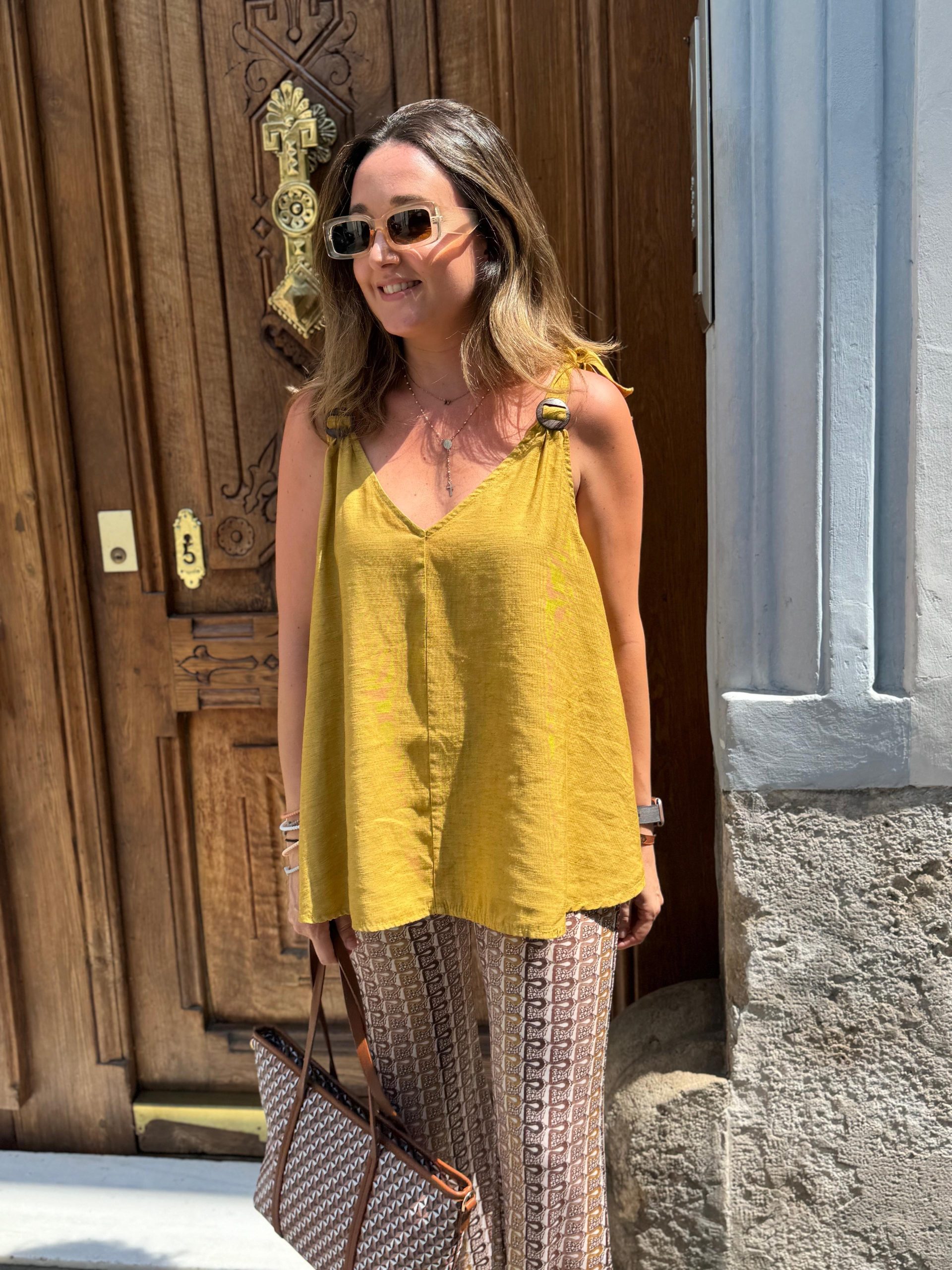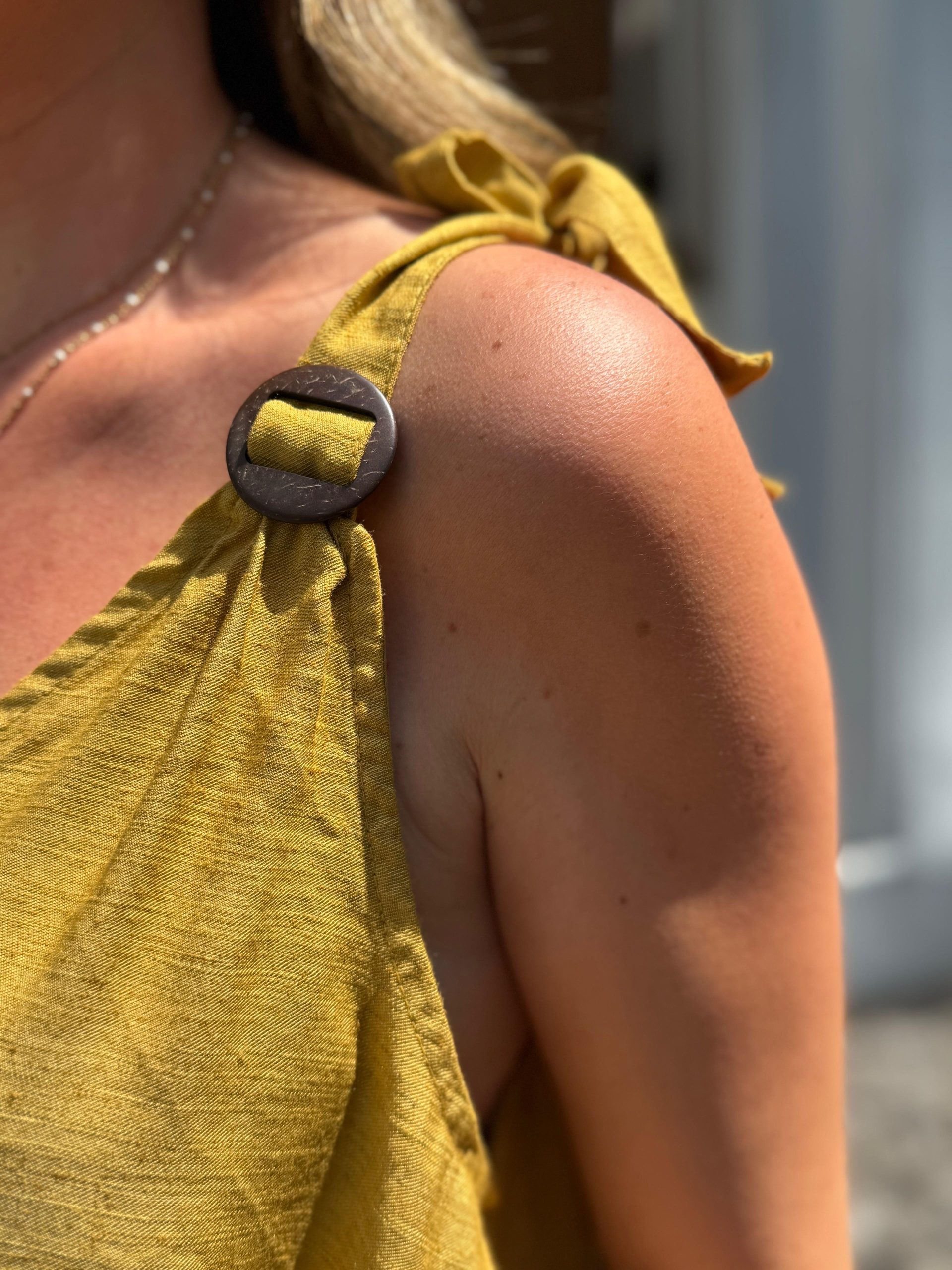 TOP LISO CON DETALLE HEBILLA Y LAZO EN EL HOMBRO. AJUSTABLE EN HOMBRO. TALLA ÚNICA. APROX HASTA UNA 42.